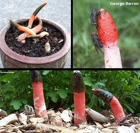 蛇頭菌學(xué)名為“Mutinus Caninus”,可以稱得上是最丑陋的菌類。蛇頭菌菌柄呈圓柱形,菌蓋呈鮮紅色,菌蓋頂端長有惡臭氣味的粘稠狀孢子。